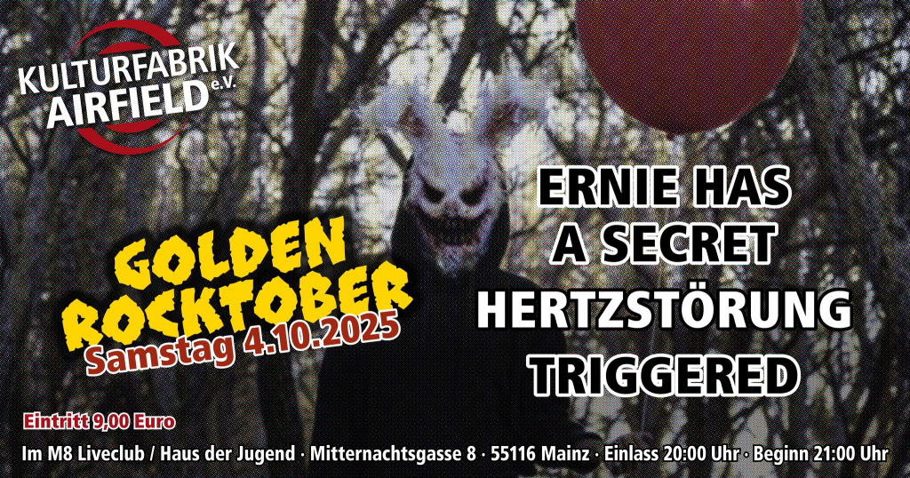 Die monatliche Veranstaltung der Kulturfabrik Airfield e.V. steuert mit Vollgas in den Herbst. Im M8-Club des Hauses der Jugend in der Mitternachtsgasse laden am Samstag, dem 04.10.25 die Bands Triggered, Hertzstörung und Earnie Has A Secret zu einem goldenen Rocktober, der keinen Besucher stillstehen lassen wird.