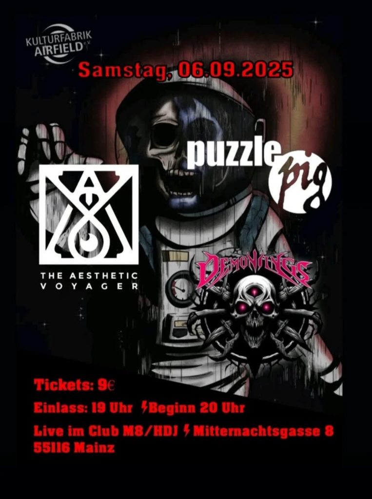 Die Sommerpause ist vorbei. Die Kulturfabrik Airfield e.V. lädt wieder zur Fortsetzung der Veranstaltungsreihe im M8 des HdJ Mainz in der Mitternachtsgasse ein. Bei der Progressive Night am Samstag, den 06.09.25 bringen The Aesthetic Voyager, Puzzlepig und Demonwings alles auf die Bühne, was deren Instrumentarium zu bieten hat.